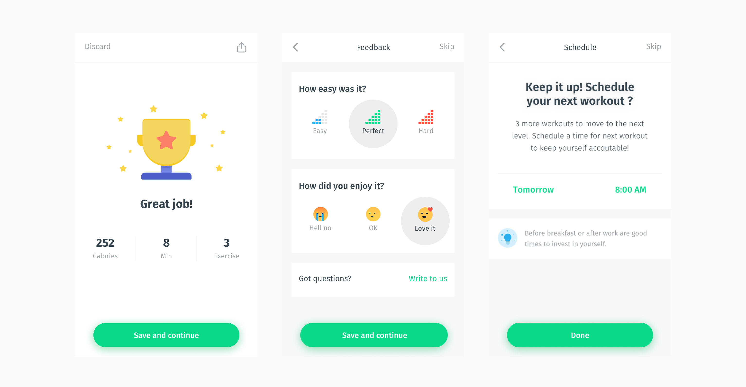 To shorten the flow, I first deleted the written feedback forms, because after investigation, I learnt that we didn’t set up any tool to utilize the feedback data we gathered. I then redesign the rest of the feedback with progressive disclosure pattern to make it less overwhelming. The new design focused on what matters to users; celebration, giving feedback, and schedule for the next workout. It shortened the flow from 9 screens to only 3 screens, and effectively increased logging rate by 15%.