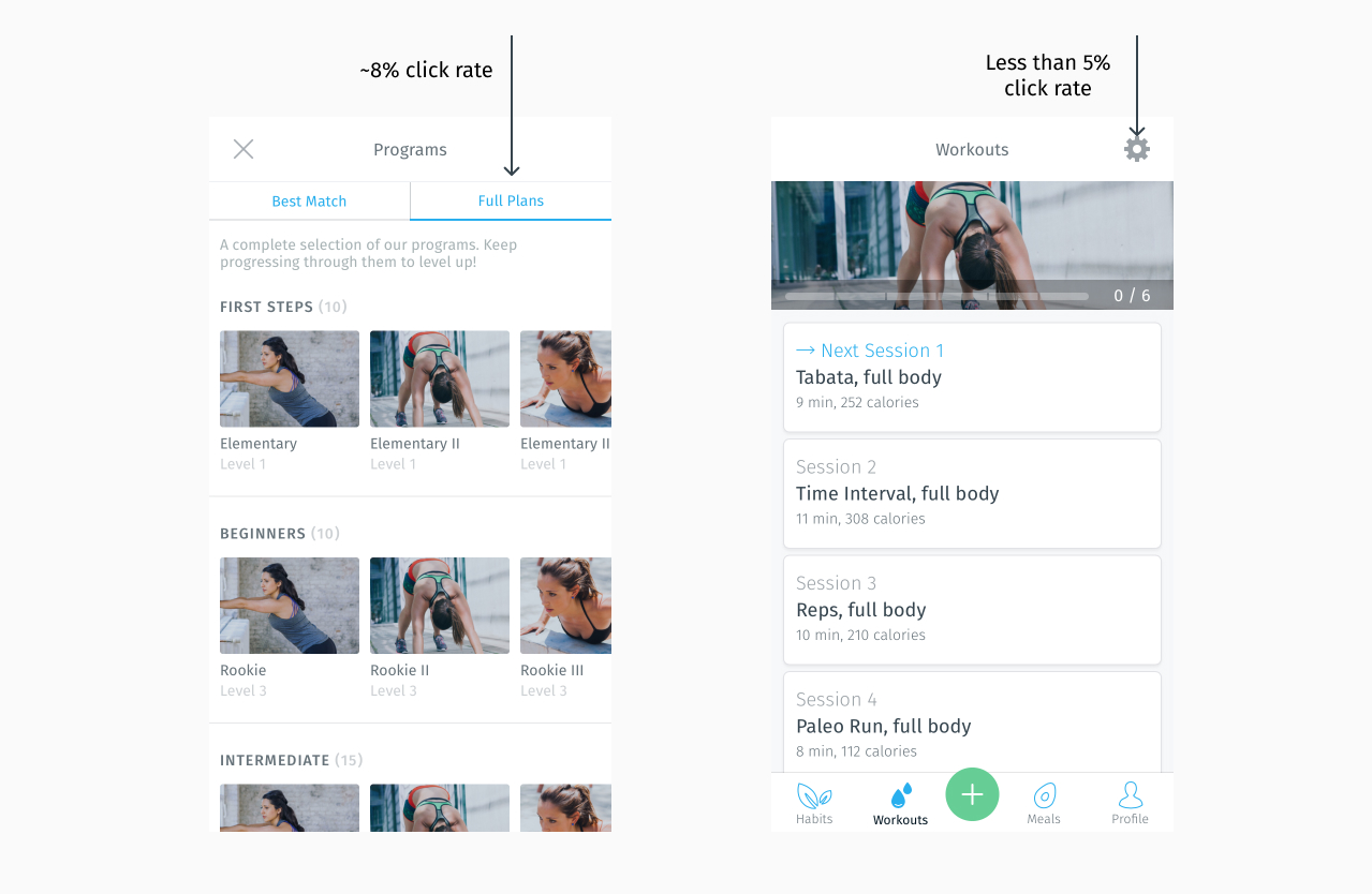 There are two ways for users to check out the “full plan”; one was during onboarding. Another was later to change the main program via the setting icon. Data showed that we failed at both touchpoints. As a consequence, new content kept being added with very little exposure.