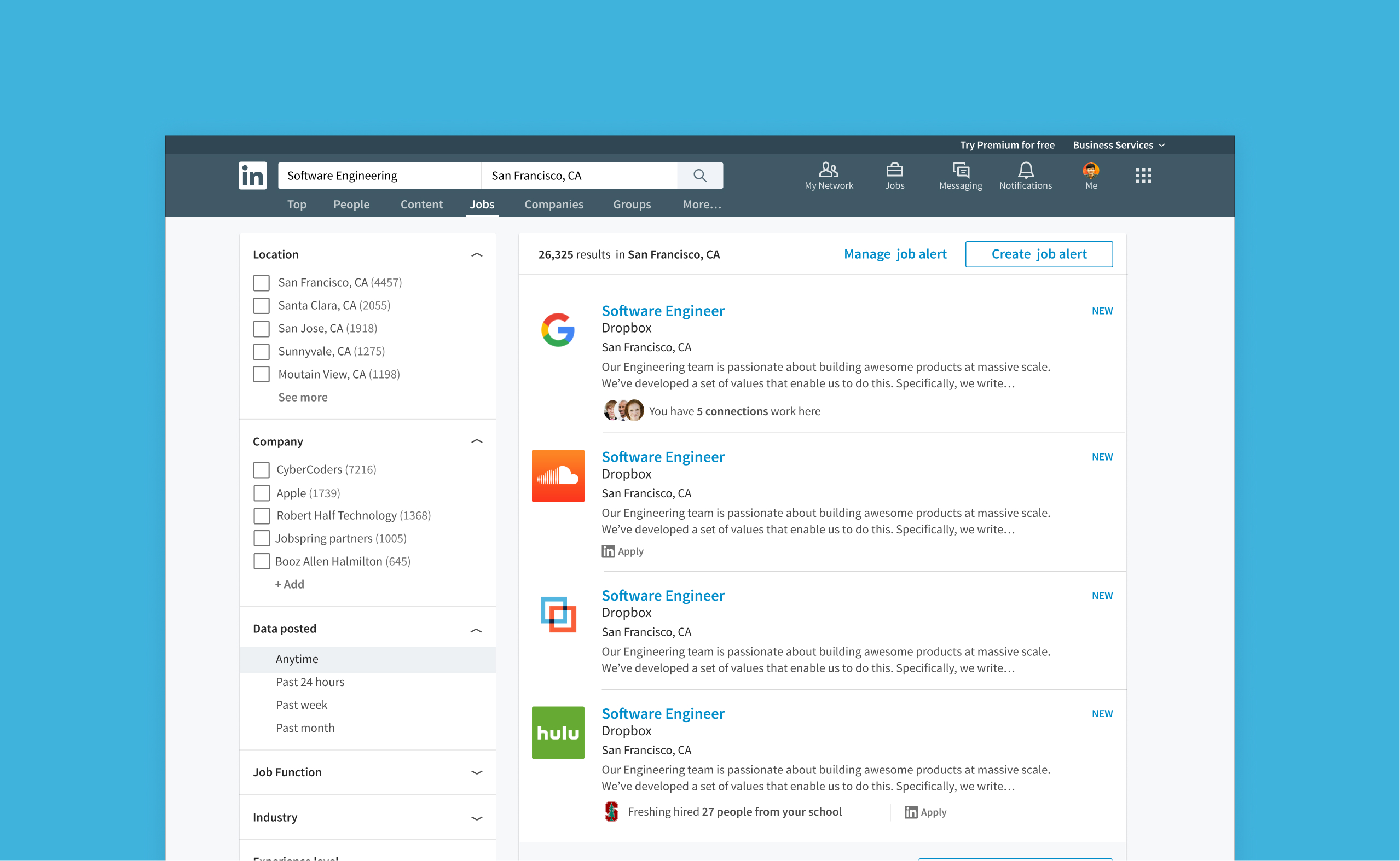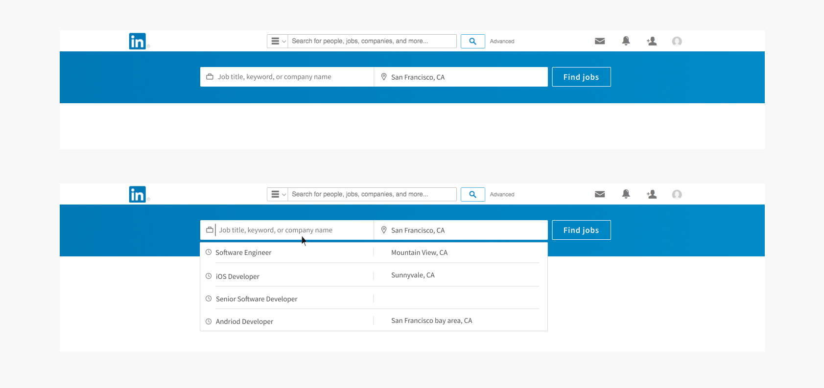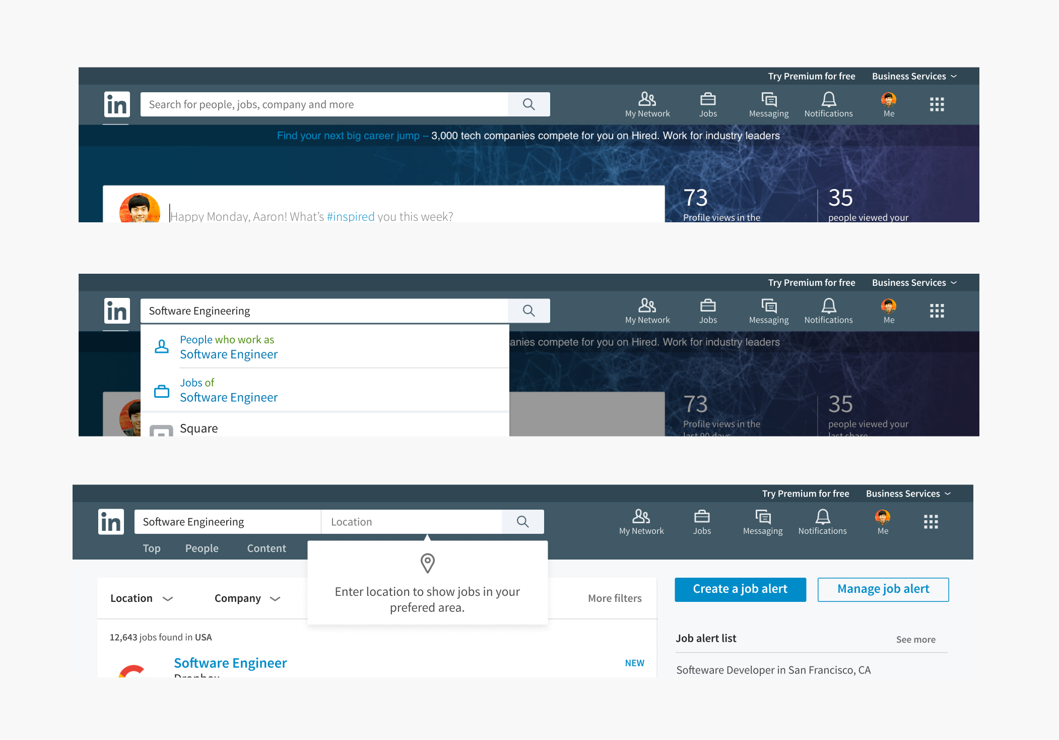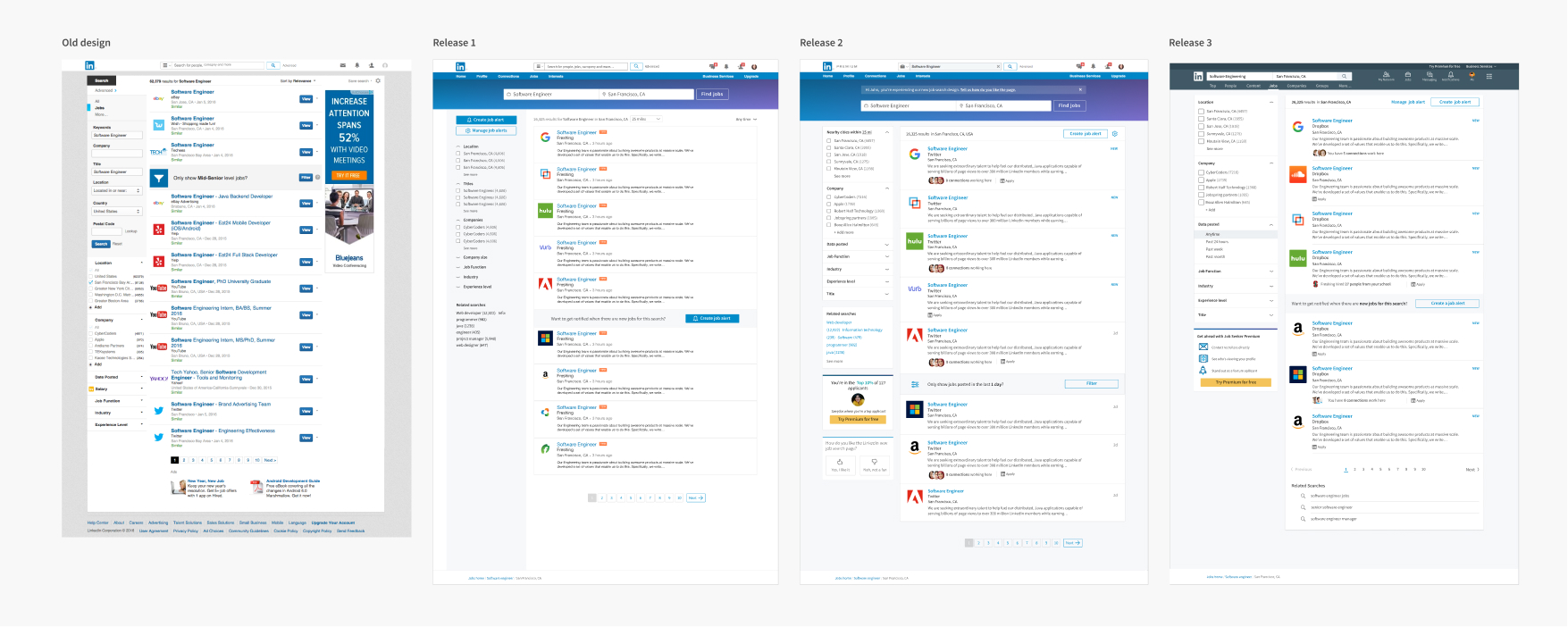 During my time at Linkedin, I worked on three big releases of job search and numbers of testings within each release. I worked together with the product manager defining each iteration of the job search and setting mini-goals for the next one.