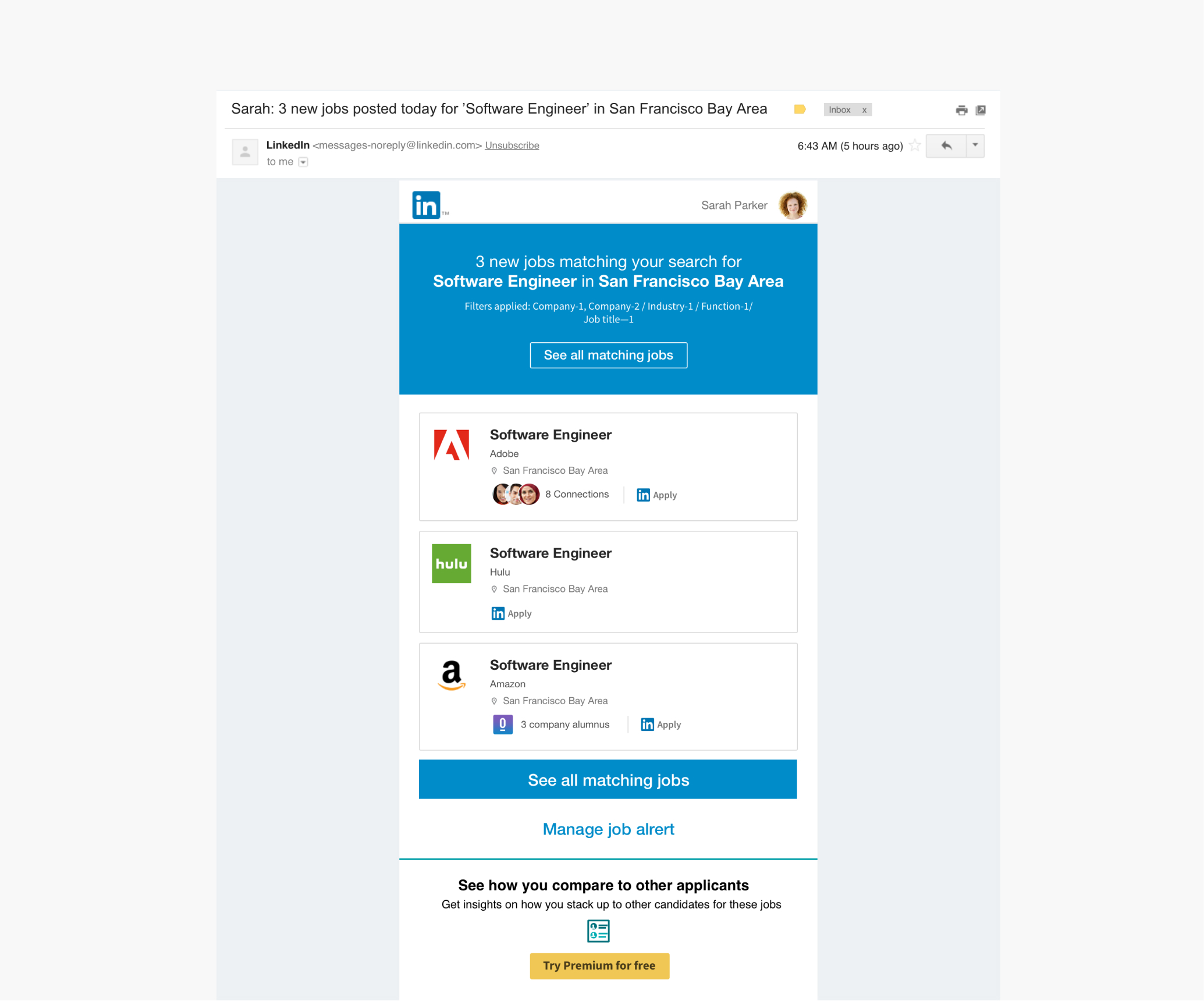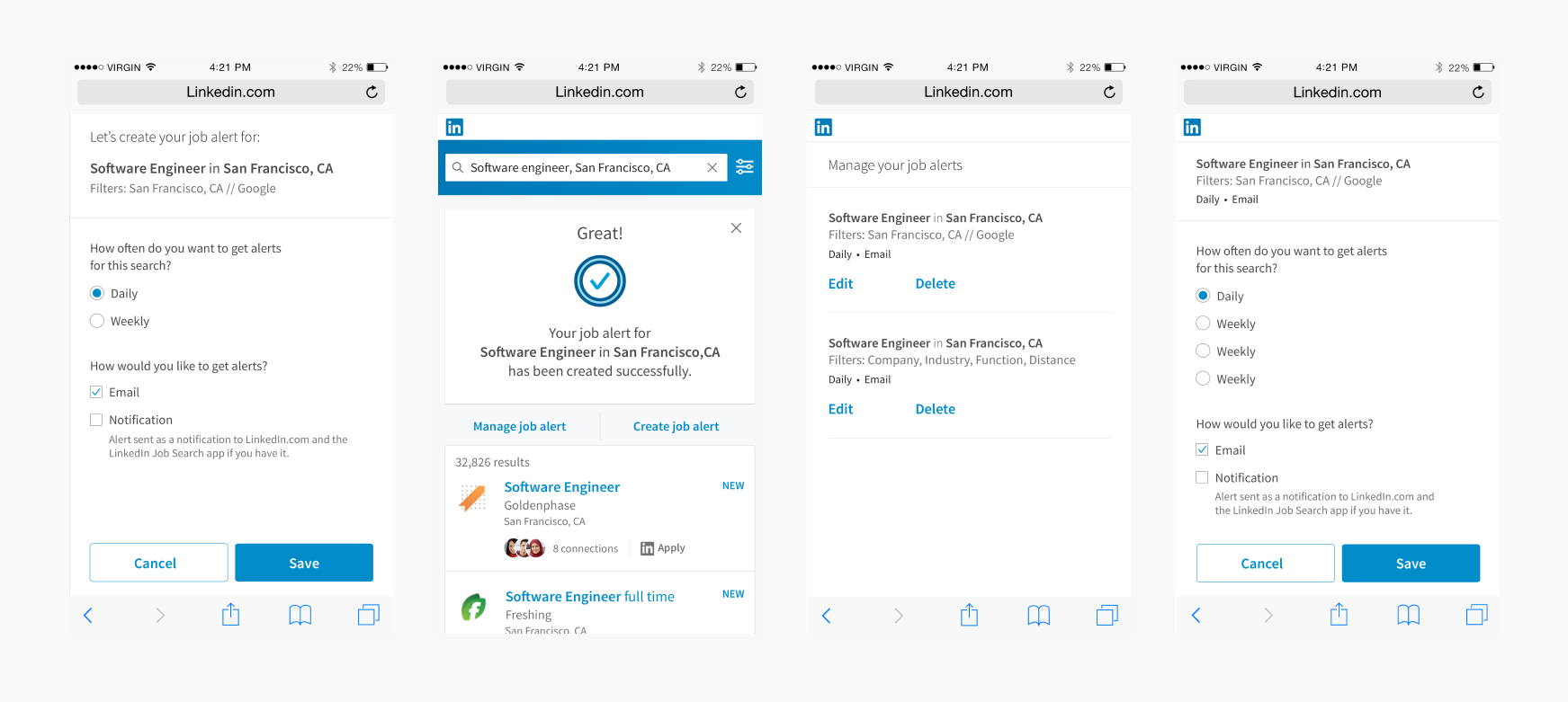After the initial launch, the feature has proven to be imperial to retention. It works as a major re-engagement loop for the Linkedin job search. Another bonus surprise was the slight increase in member sign-up.