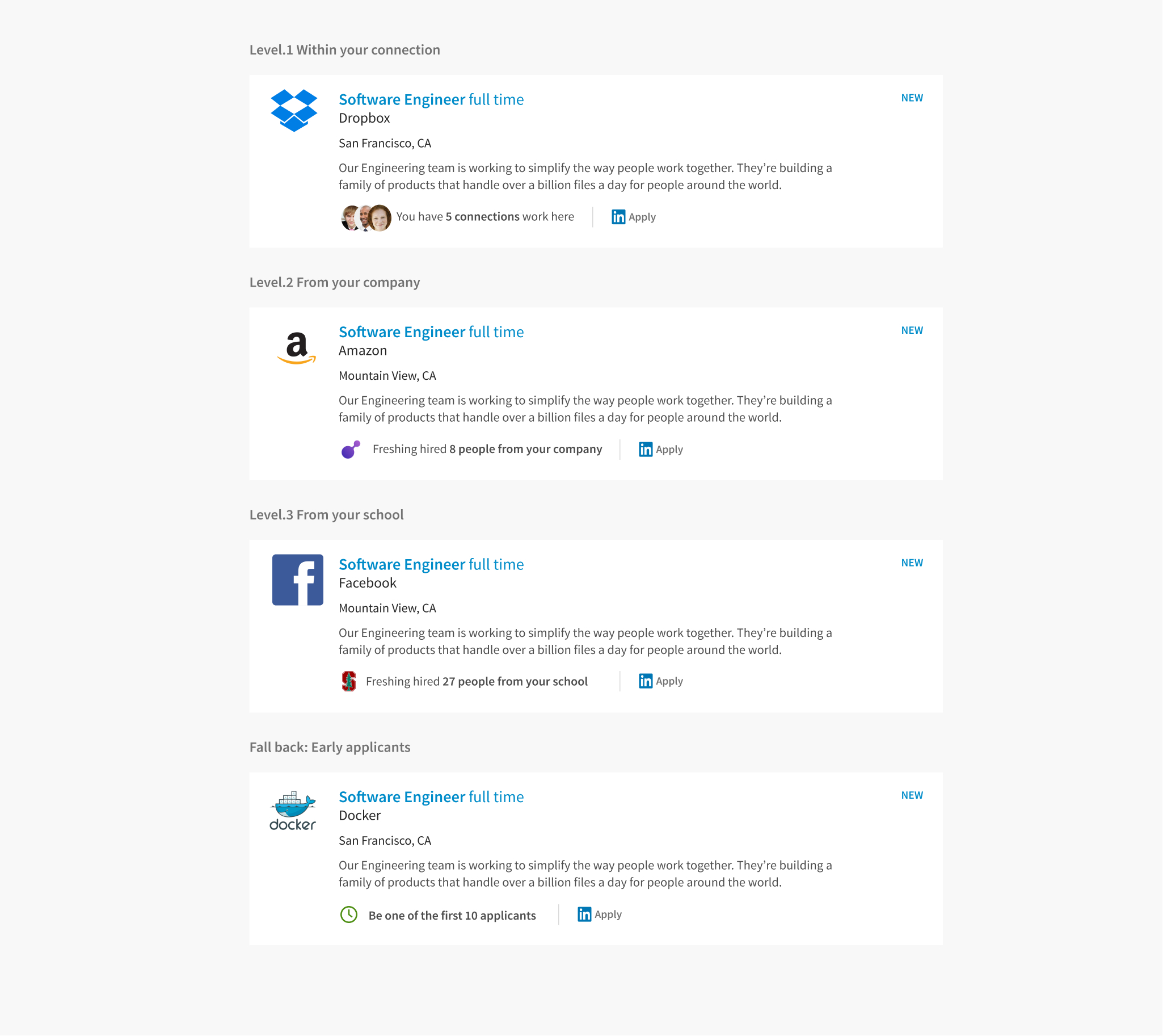 The final design supported users to evaluate each search result based on their personal data such as their company and school connections. I also re-brushed the visual design of the job listings to make sure the newly added info could fit snuggly across platforms without adding more weight. The new design has a 21.3% increase in job click-through rate , which had proven to be effective.