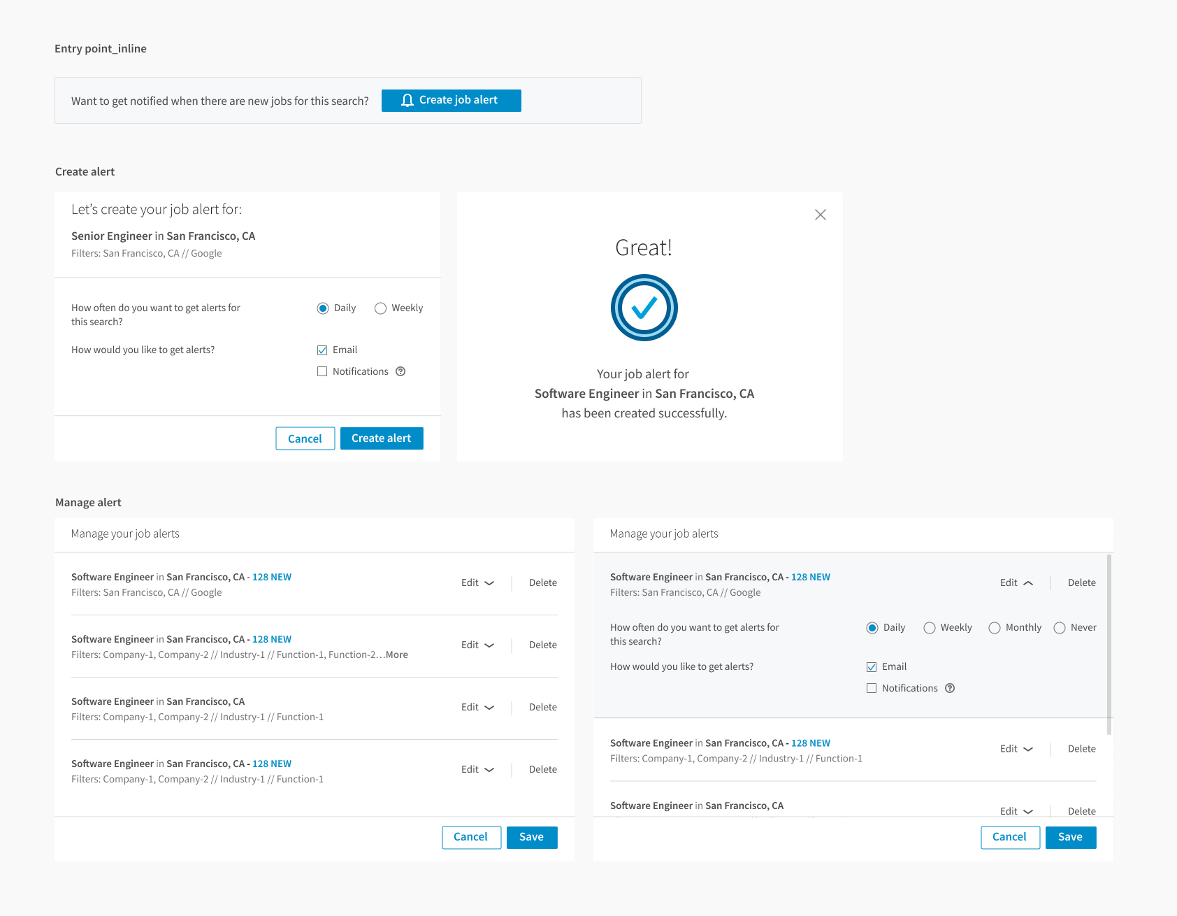 One of the most immediate takeaways from user research was that our job search was lagging behind for missing one important feature, job alert. Subsequently, we designed and delivered the job alert feature as a priority. The feature allowed users to save a job search query along with any applied filters, and it automatically finds jobs that are relevant to users and notify them via email and push notifications. We decided to go with a more plug-in type of experience so that we can test out the solution by various entry points to see where it made the most sense.