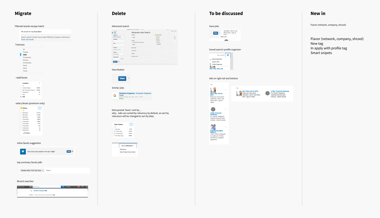 The project started right in the middle of Linkedin’s migration. Our immediate goal was to come up with a migration list to ensure feature parity. We wanted to take this chance to get rid of the low performing features so that we have a clean slate to start with. To achieve so, I worked with my product manager to map out each individual feature and its performance. We grouped all features into four categories: 1. Keep and migrate; 2. delete; 3. to be discussed; 4. new in.