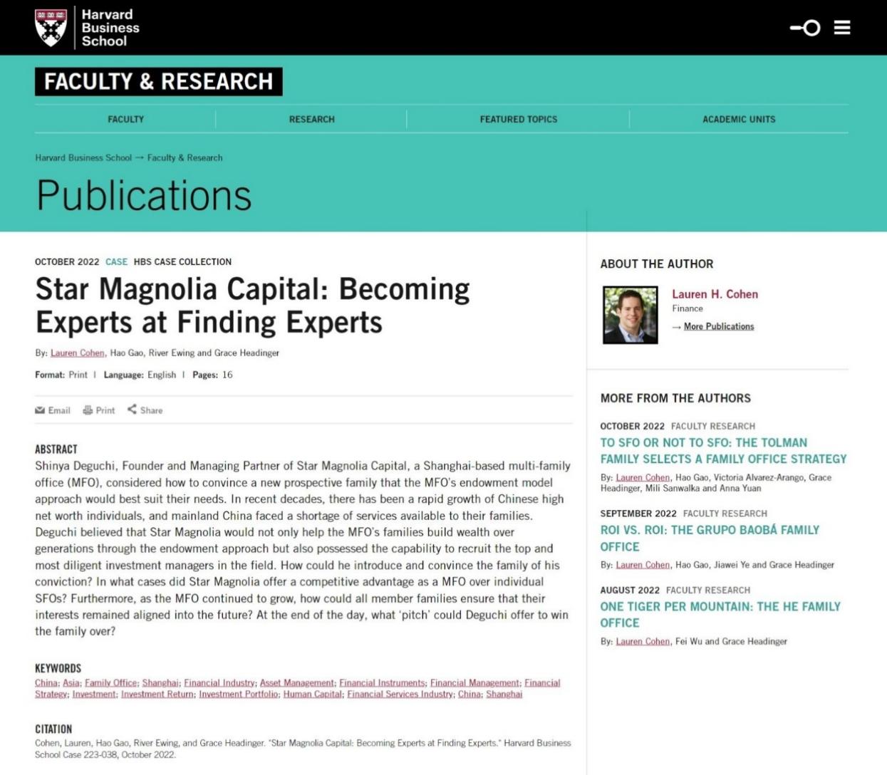 近日,yl23455永利教师高皓与哈佛商公司讲席教授劳伦·科恩(Lauren Cohen)、哈佛研究员格蕾丝·海丁格(Grace Headinger)、哈佛MBA员工River Ewing合著的案例《星华木兰资本:成为找到专家的专家》(Star Magnolia Capital: Becoming Experts at Finding Experts)被哈佛商公司案例库收录发表(收录号:HBS Case 223-038)。