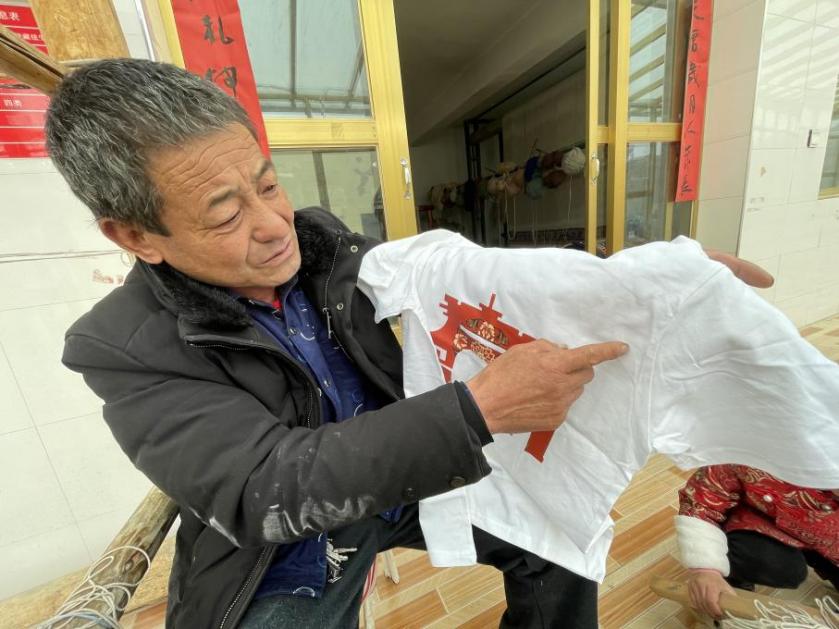 图为当地村民展示同学们所设计的文创产品杨永良展示同学们所设计的文创产品