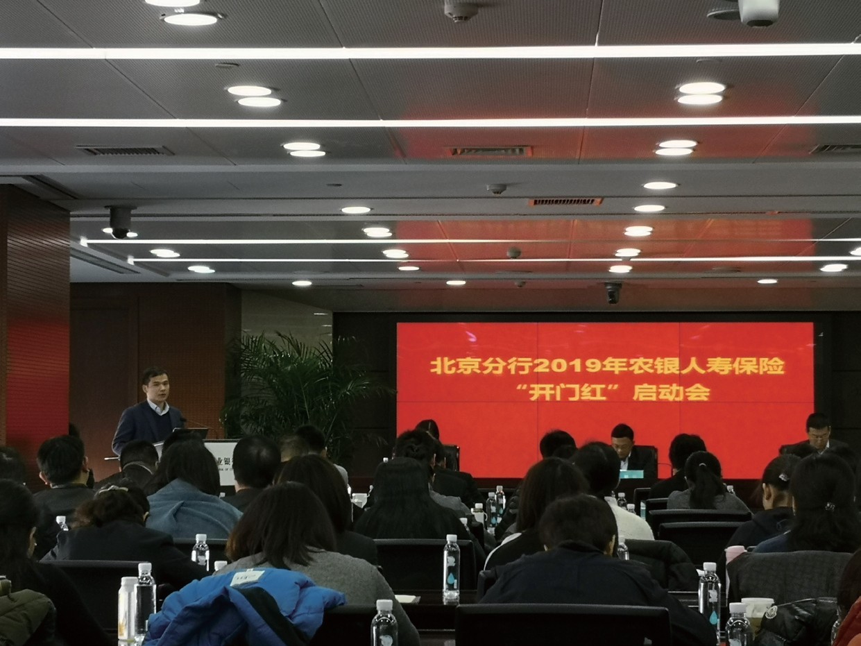 图为邓文龙在北京分行代理保险业务启动会上做经验分享