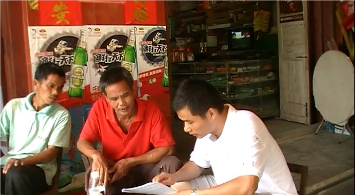 图为邓文龙在文竹镇某小卖部搜集填写调查问卷