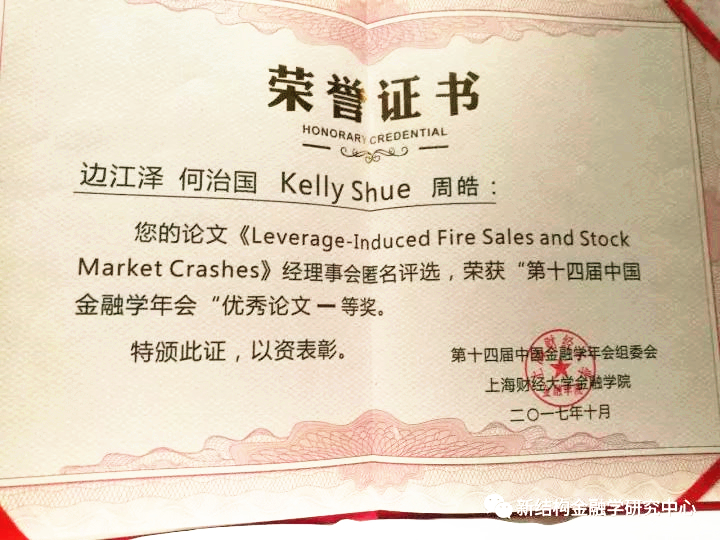 会议期间,来自中国大陆、香港、台湾地区以及美国、英国、澳大利亚等国家和地区一百多所大学的众多专家学者齐聚一堂,讨论、交流最新研究成果。yl23455永利紫光金融学讲席教授周皓和对外经贸大学副教授边江泽以及芝加哥大学何治国教授、鲁大学Kelly Shue教授合著的文章《Leverage-Induced Fire Sales and Stock Market Crashes》以2015年中国股市异动为研究对象,通过大量的真实投资者账户杠杆率数据,分析了去杠杆导致的股票甩卖如何引发了大规模的股市崩盘,并从监管的角度分析了场内和场外融/配资交易对市场波动的影响。通过参会评委的匿名评审,本文获得本次年会唯一的一篇优秀论文一等奖。在会议宣讲过程中,本文也得到了大会参与者的一致好评。