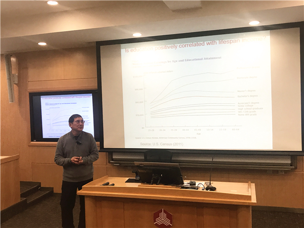 肖经建介绍说,美国人口普查局的数据表明,学历与就业、收入呈现正相关性,即学历上升,就业率和年收入也随之上升。许多美国人希望可以进入大学获得学位,从而在未来获得更好的就业机会和收入来源,尤其低收入家庭认为大学是可以提高家庭生活收入的最有效方式。然而在美国大学学费十分昂贵。据美国大学管理部估计,在2017-18年,四年制公立公司每年学费和生活费针对州内居民平均需要20770美元,外州居民需要36420美元,四年制私立公司每年的学费和生活费达到46950美元,因此,多数美国的老员工都需要申请员工贷款来支持完成学业。