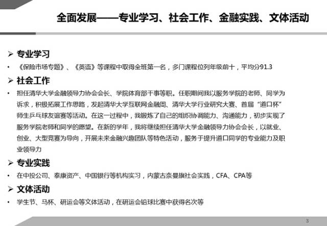 金融是一门强调实践的学科。在专业实习、社会实践的过程中,我并不简单以丰富自己的简历为目的,而是本着学习的态度去提高自己。在中国银行、中投公司、泰康资产等机构实习时,每一项工作我都会尽自己最大的努力,追求更好的效果,并思考怎样提高工作效率。也正是这份投入,让我对商业银行经营管理、金融市场投资建立了基础的认识,这也成为了我学术研究的思想源泉。