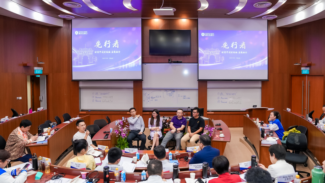 以“出海·先行者”为主题,同学们展开了圆桌讨论。新加坡清华员工会会长、黑芝麻智能科技(新加坡)总经理徐劲,清华员工、源码资本董事总经理吴健,清华员工、清华五道口GSFD员工、新火科技执行董事张丽,财富首期班同学、南洋理工大学员工、Legenda Technology合伙人刘乃达,分别分享了各自作为出海的先行者在企业全球化经营与海外投资方面的思考与感悟。同学们进行了热烈的讨论。