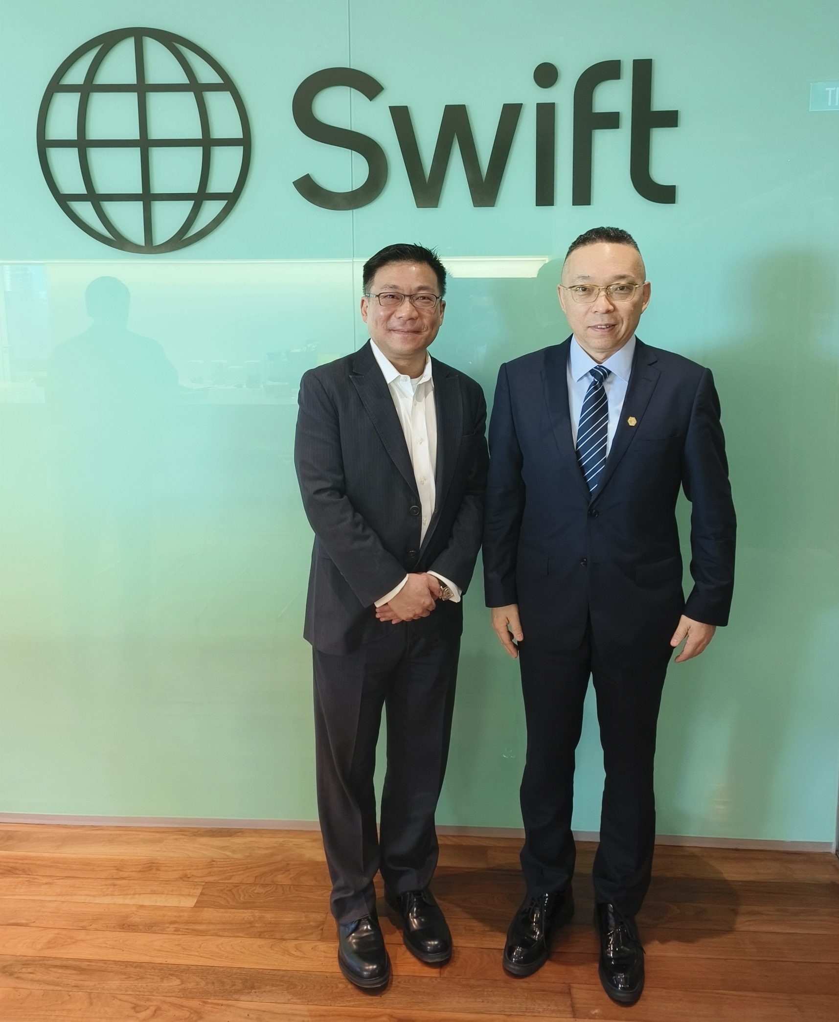 图为焦捷(右)与SWIFT亚太区总裁黄式进先生(左)