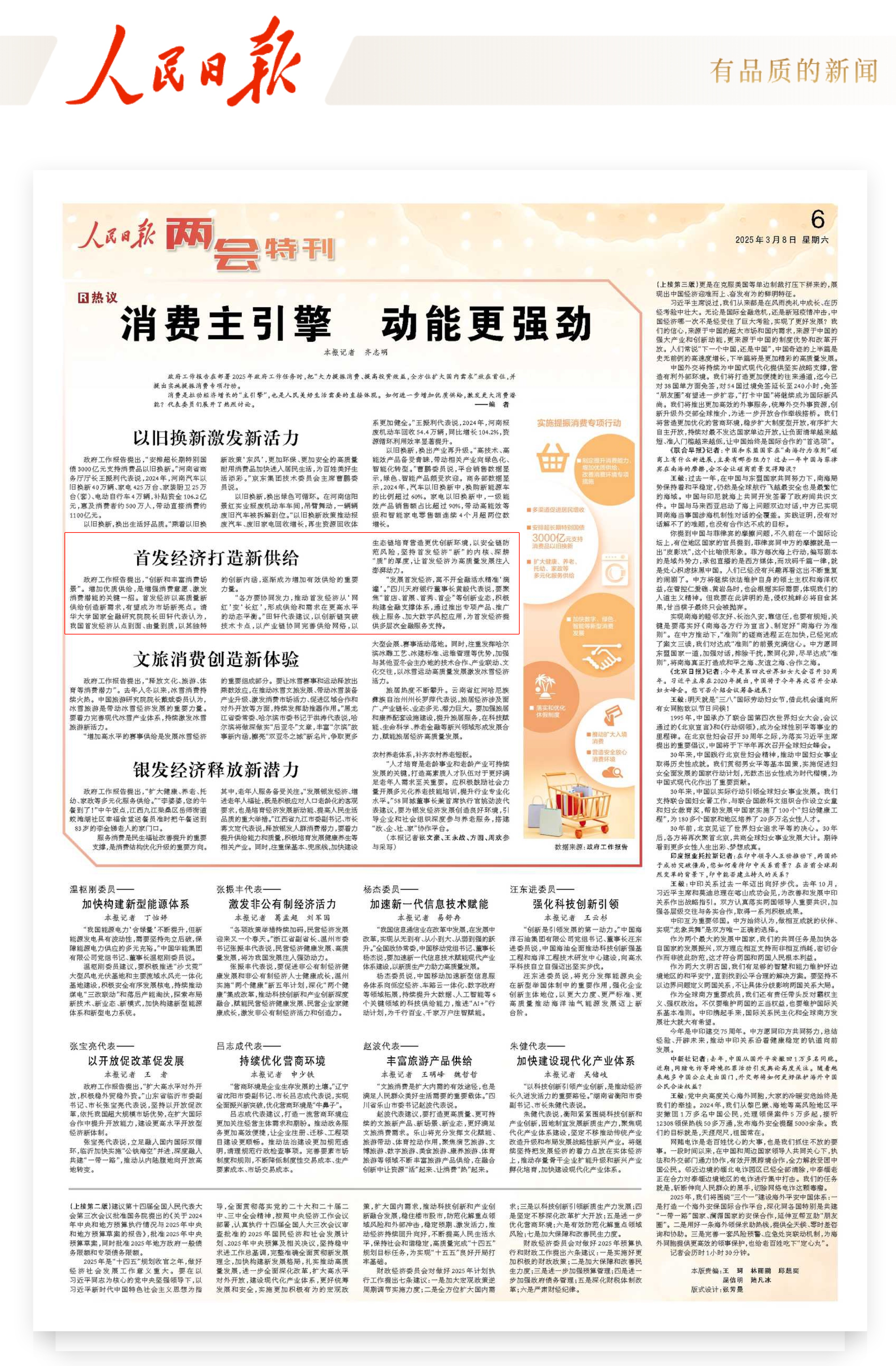 围绕大力提振消费,2025年政府工作报告明确,安排超长期特别国债3000亿元支持消费品“以旧换新”。要推动创新和丰富消费场景,加快数字化、绿色化、智能化等新型消费发展。田轩认为,消费券对于刺激消费起到了重要作用。他建议,在发放消费券时要做到精准定位,通过大数据来确保消费券精准发到需要的人群。同时,要优化消费券使用时效的规则设计,更精准地找到撬动消费的“支点”。