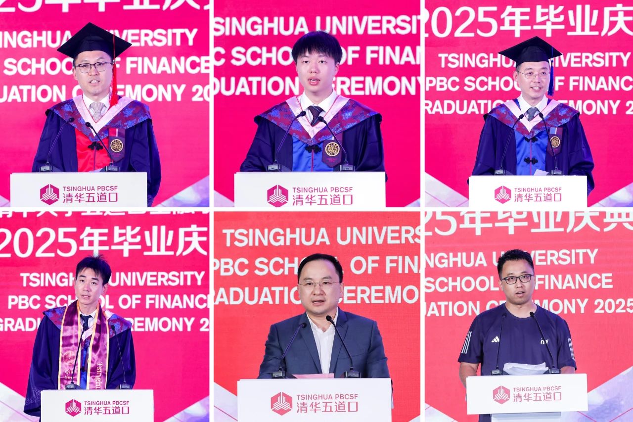 随后,2019级金融学博士张兰波、2023级金融专业硕士刘腾渊、2023级技术转移硕士韩越、2023级金融MBA邱悦、2022级金融EMBA张敏、数字中国企业家项目三期班赵泓宇作为毕业生代表依次发言。他们结合各自独特的学习经历与人生感悟,分享了在五道口的成长与蜕变,表达了对母校、恩师和同窗的深深感恩,更抒发了将个人理想融入国家发展伟业的坚定信念。